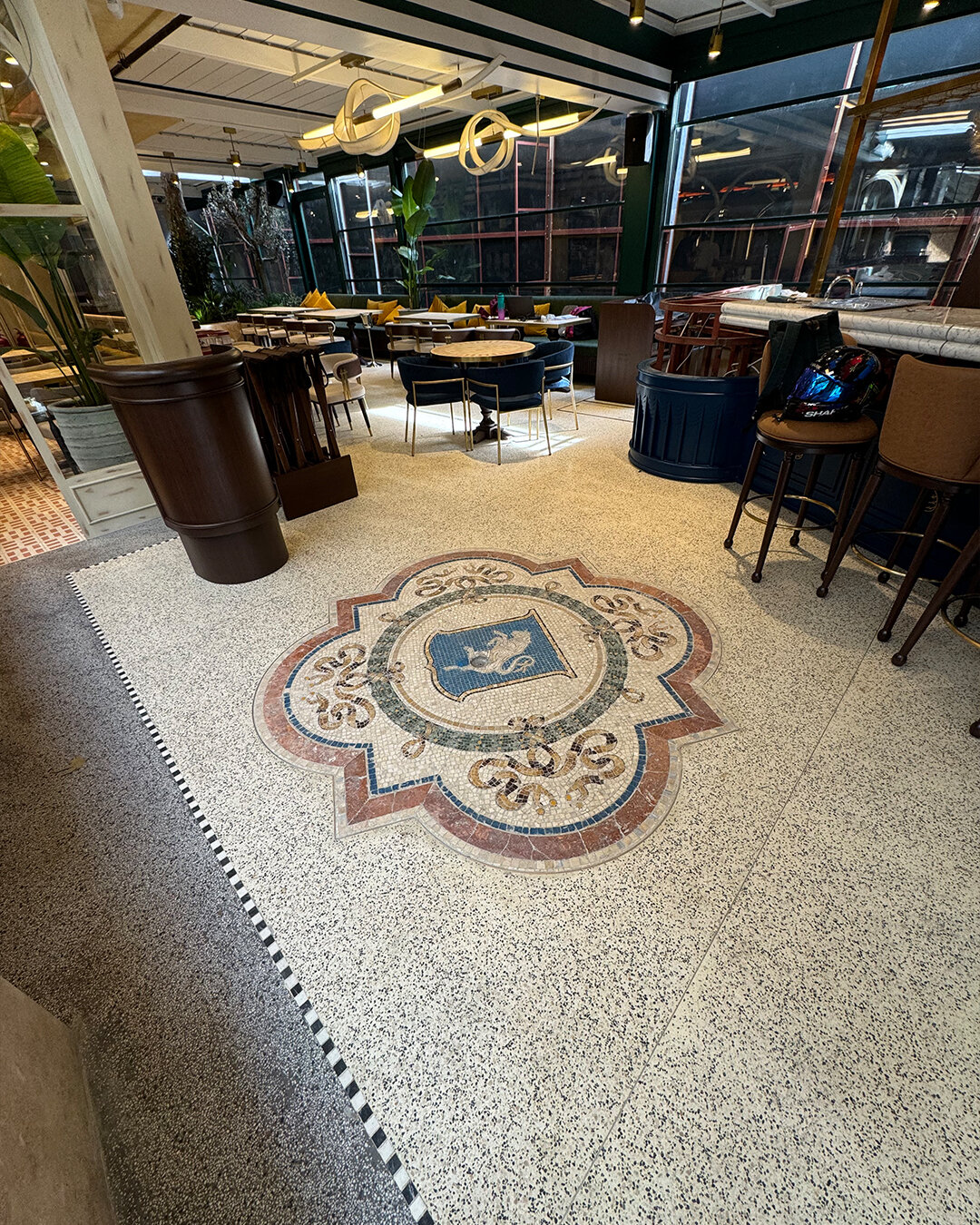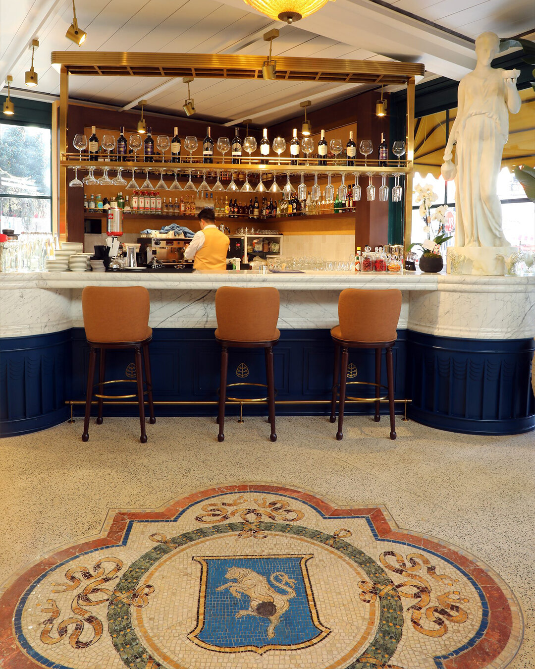 Natural stone textures, special marble surfaces and mosaic floors prepared with handcraft strengthen the architectural identity of the restaurant, while the bull-figured mosaic on the floor was designed with inspiration from the famous Galleria Vittorio Emanuele II in Milan.