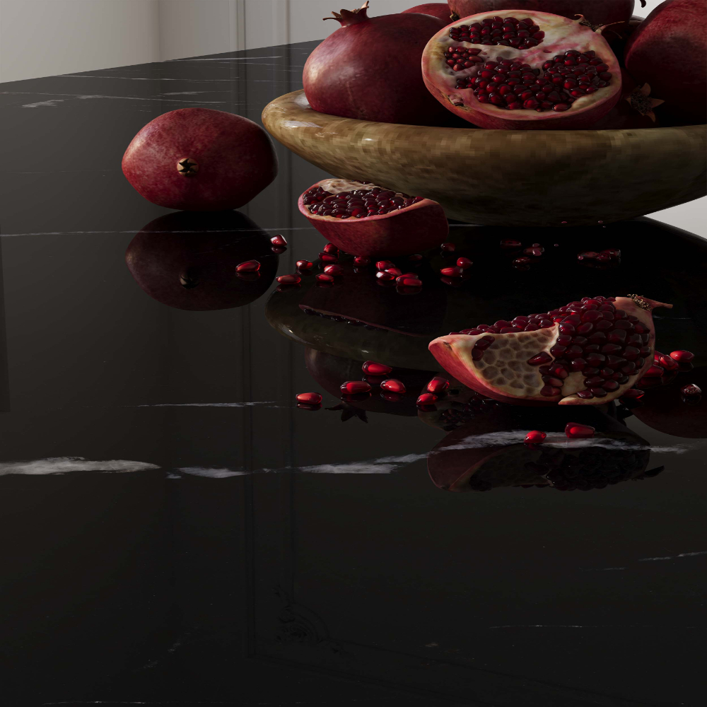 The rich black background enhanced by dynamic veining patterns introduces dramatic sophistication to any interior, transforming surfaces into eye-catching focal points.