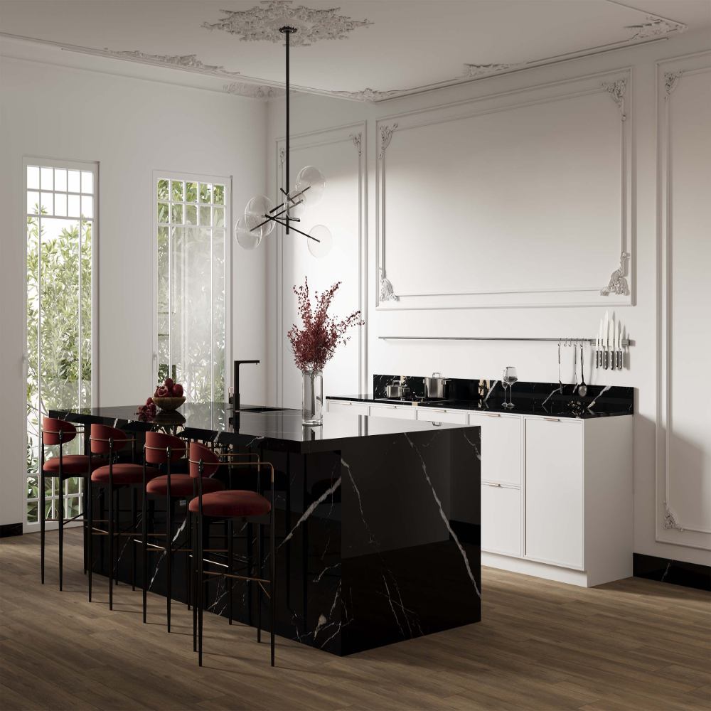Its heat, stain, and scratch resistance make it ideal for high-traffic kitchens that require long-lasting performance and style.