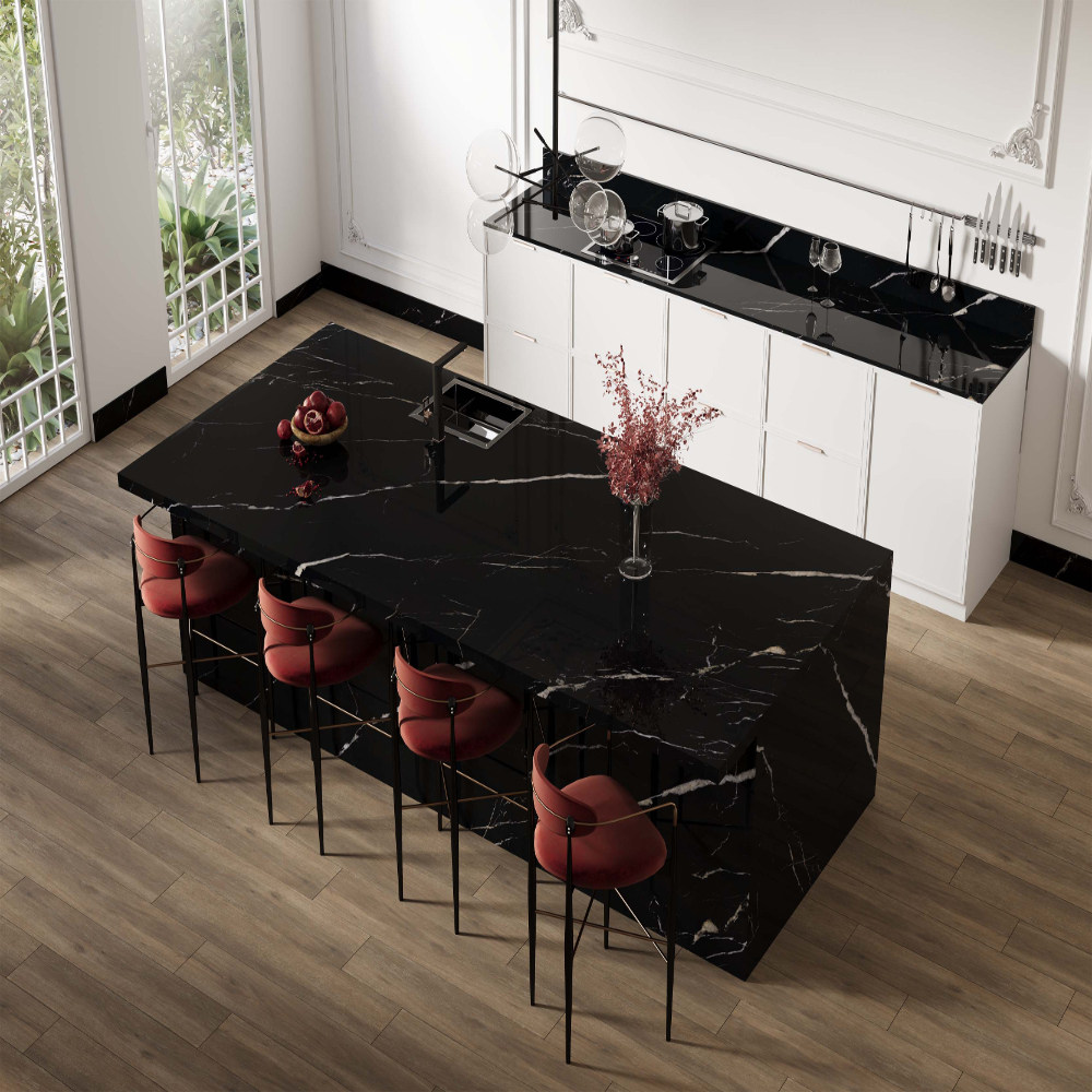 Black Calacatta Porcelain is a premium porcelain surface inspired by the elegant veining of natural Calacatta marble. Its deep black base combined with striking white and gold veining creates a powerful visual statement, making it ideal for both residential and commercial designs. It offers the timeless beauty of marble with the advanced durability of porcelain.