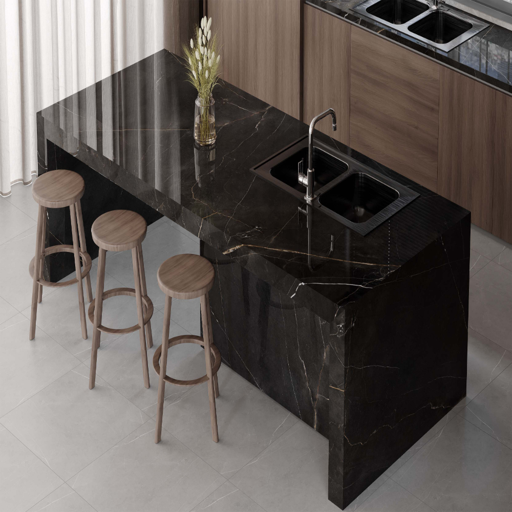 Marron Glace Porcelain combines deep brown tones with elegant golden veining, offering a refined and luxurious surface for kitchens, bathrooms, floors, walls, and furniture applications. It delivers both high durability and timeless visual appeal.