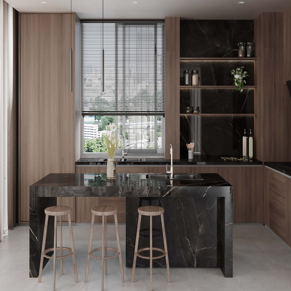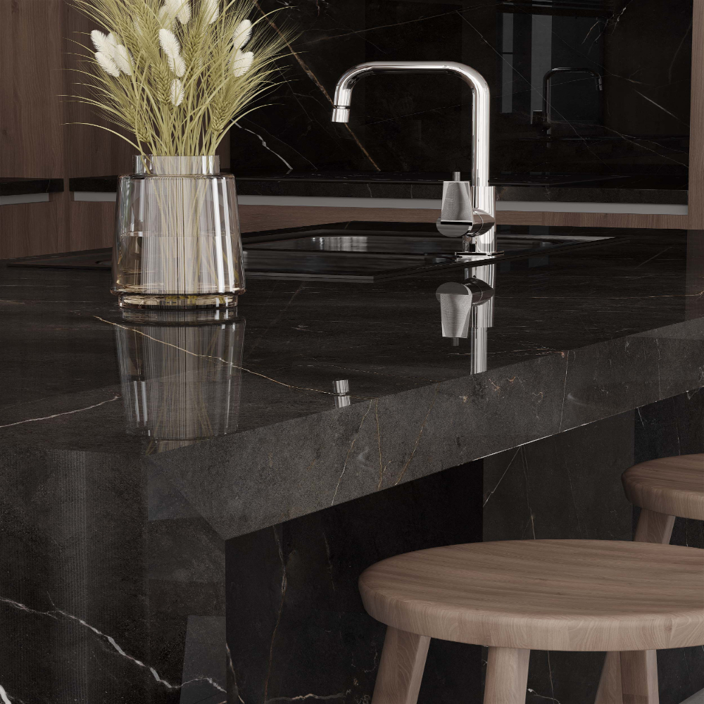 With its resistance to heat, scratches, and stains, Marron Glace Porcelain is ideal for kitchens. Its reflective and rich-toned surface turns islands and countertops into the focal point of the space.