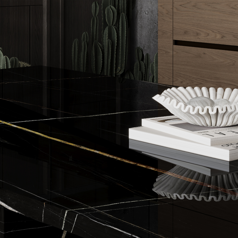 When paired with light woods, soft neutrals, or minimalist décor, the surface becomes a striking focal point. Its dramatic black base provides depth, contrast, and visual richness that complements modern design trends.