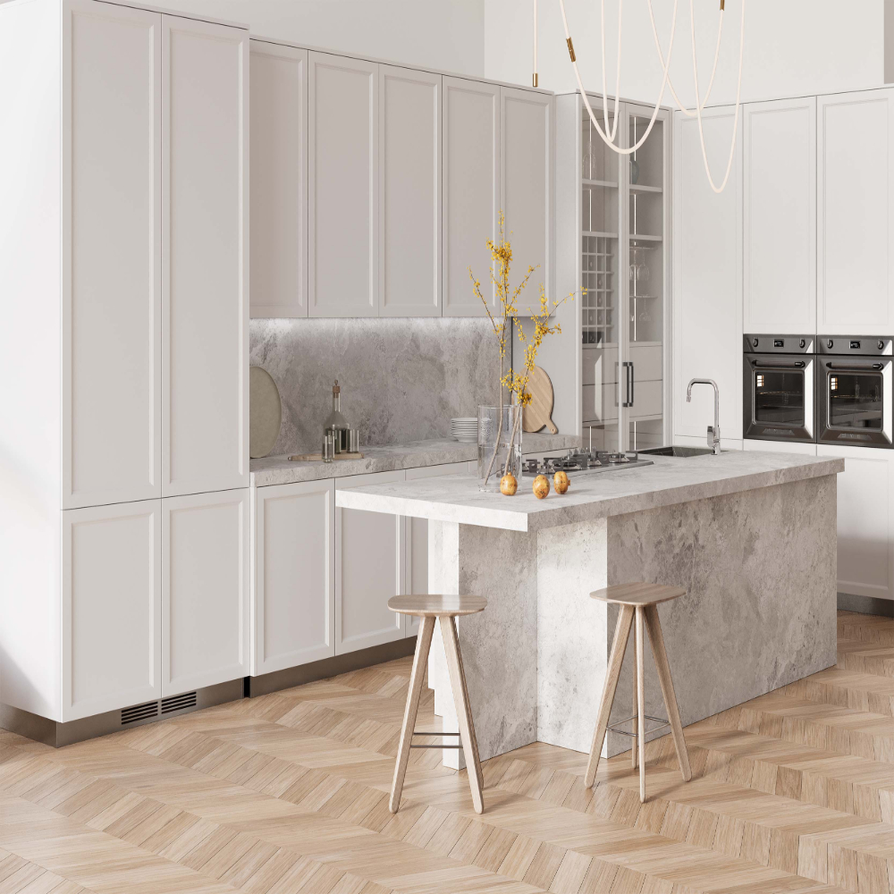 Silver Cloud porcelain countertops are designed to handle intensive daily use. Hot cookware can be placed directly on the surface, and cutting or food preparation does not compromise its structure. The matte finish minimizes fingerprints and keeps the surface looking clean and refined.