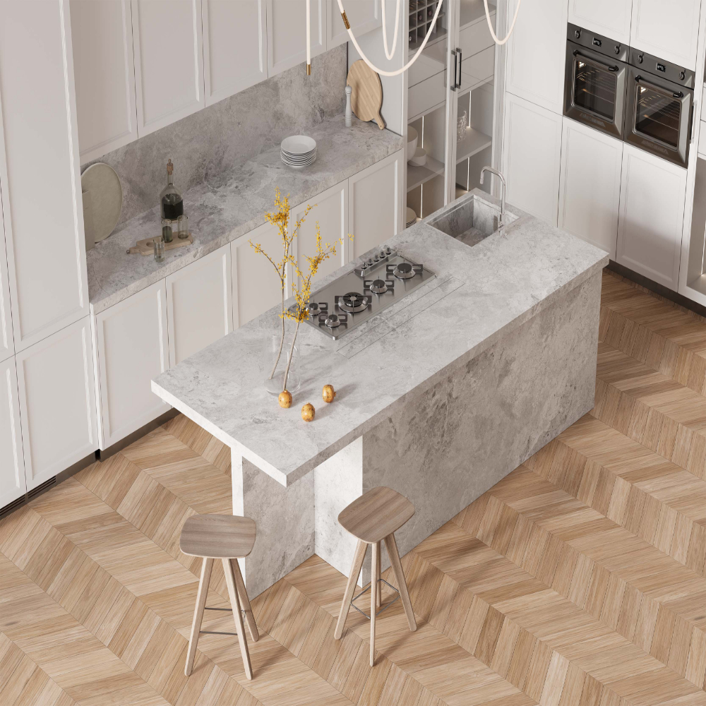 Silver Cloud porcelain combines soft grey and white cloud-like patterns with a matte surface finish, creating a calm and modern aesthetic. Its durable porcelain structure makes it an ideal choice for kitchen countertops, islands, bathrooms and interior wall applications.