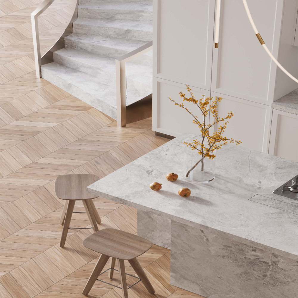 Silver Cloud features light grey tones blended with soft white transitions, avoiding sharp contrasts. This natural visual balance creates a spacious and airy feeling, especially in modern, minimalist and Scandinavian-style interiors. The matte surface enhances the natural stone look while reducing glare.