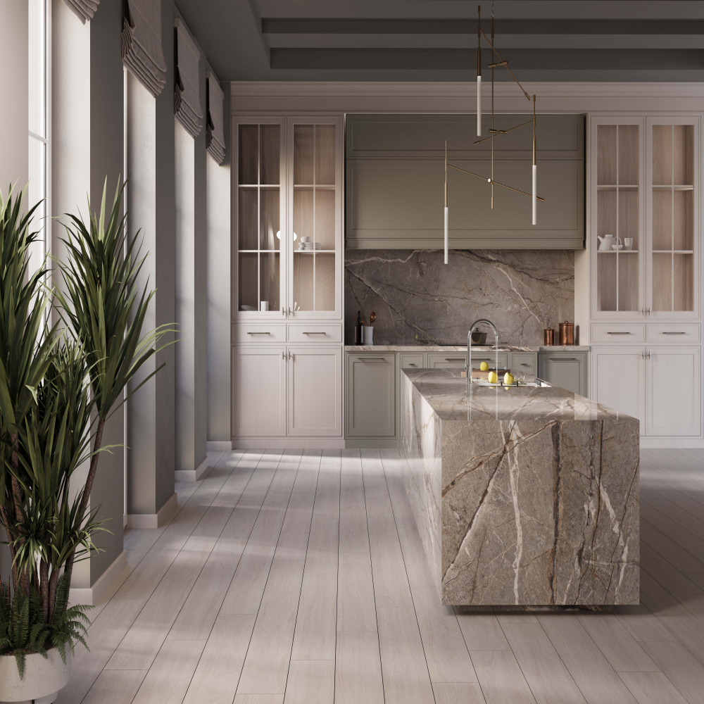 The refined grey base of Silver Root is carefully enriched with soft white and warm mineral veins. This harmonious color palette allows the surface to adapt effortlessly to both light and dark interior designs, making it ideal for modern, minimalist, industrial, and classic architectural styles.
