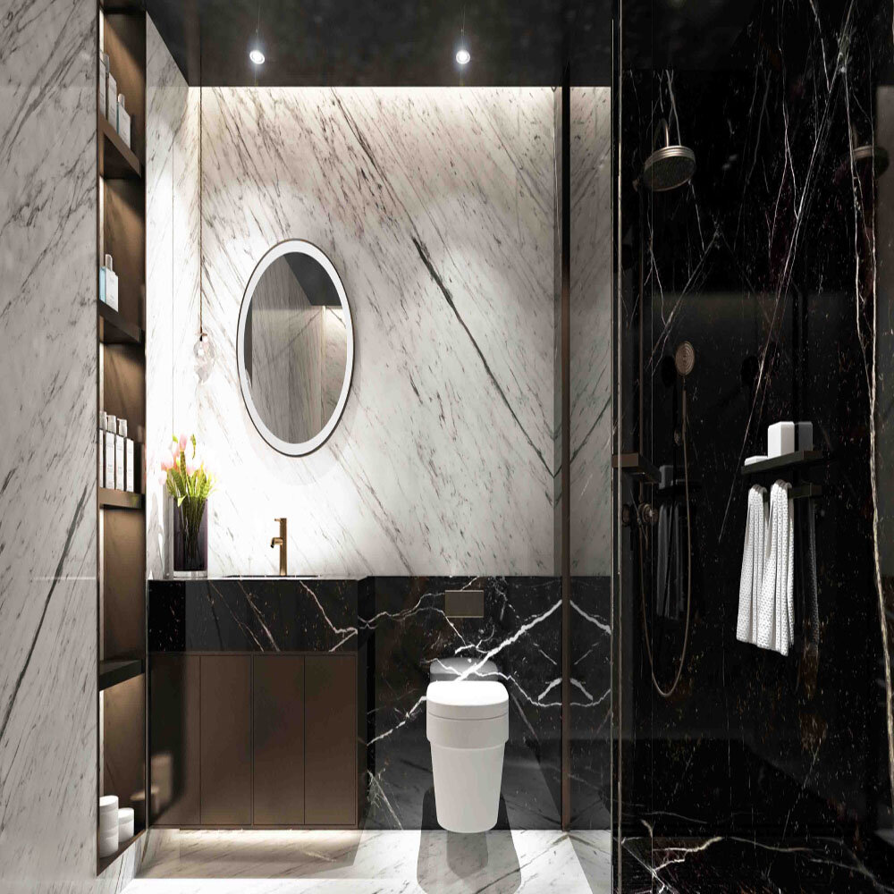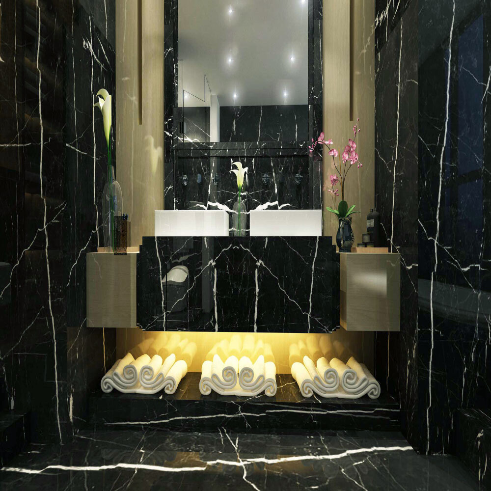 Nero Marquina Mermer, derin siyah rengi ve belirgin beyaz damarlarıyla kontrast yaratarak mekana lüks bir hava katar. Yoğun yapısı sayesinde darbelere karşı dayanıklıdır ve uzun yıllar boyunca ilk günkü görünümünü korur. Parlak yüzeyi, ışığı yansıtarak geniş ve ferah bir atmosfer oluşturur.