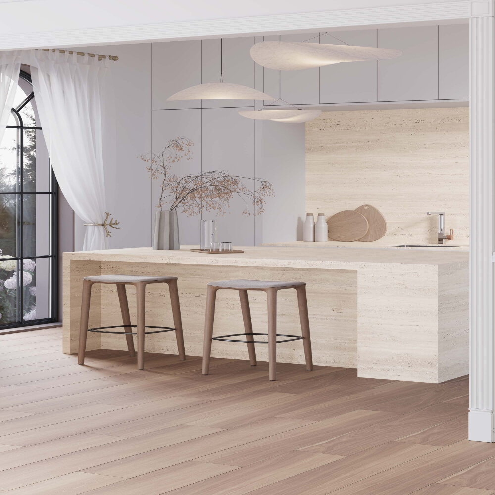 White Traverten Porselen, klasik traverten taşının sıcak karakterini modern mimariyle buluşturur. Her detayı doğadan ilham alınarak tasarlanan yüzeyi, sade dokusuyla dikkat çeker. Yüzeydeki ince damar geçişleri, doğanın zarif bir ritmini yansıtırken, renk uyumuyla mekanlara dingin bir enerji kazandırır.