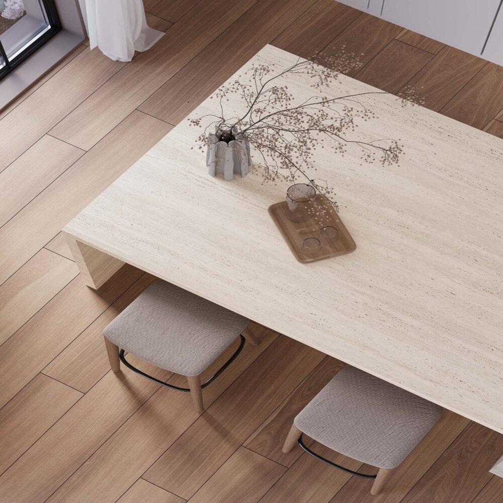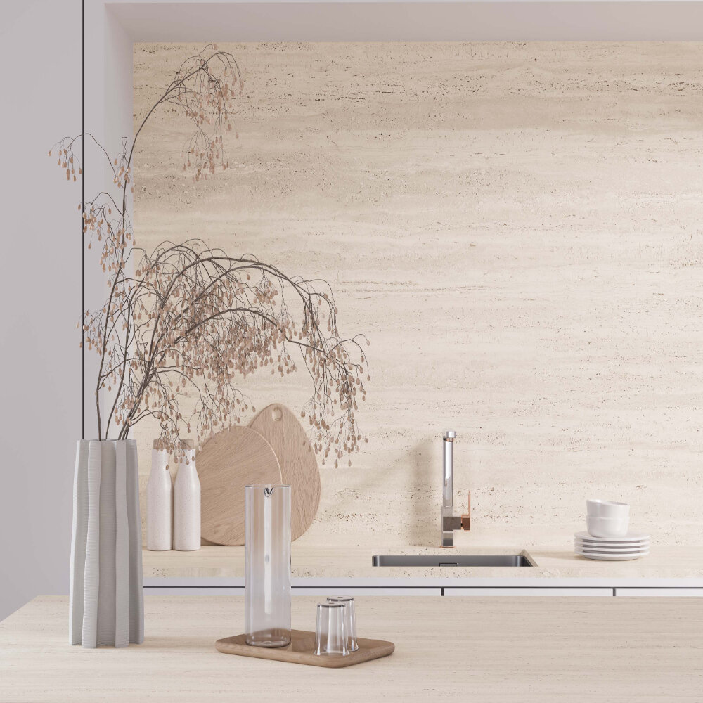 White Traverten, açık bej ve krem tonlarının zarif bir karışımına sahiptir. Bu renk paleti, farklı dekorasyon stilleriyle mükemmel uyum sağlar: